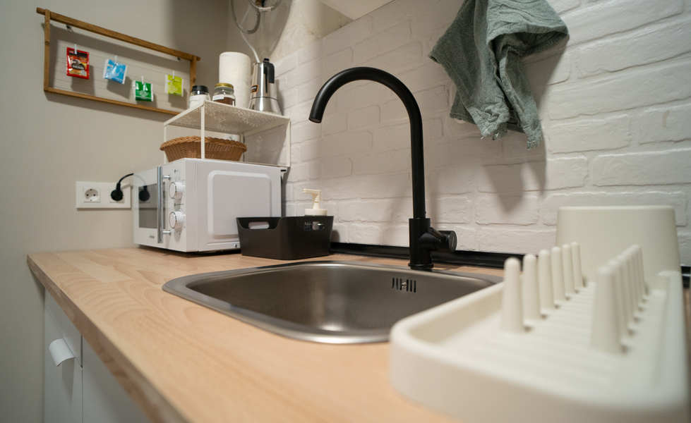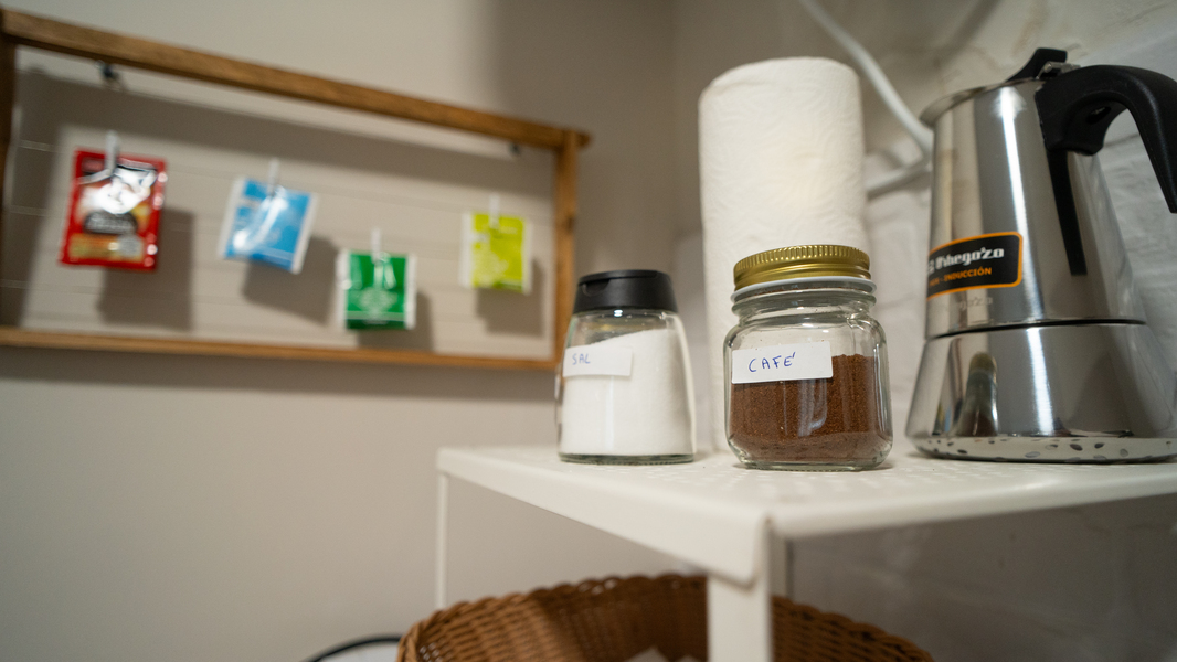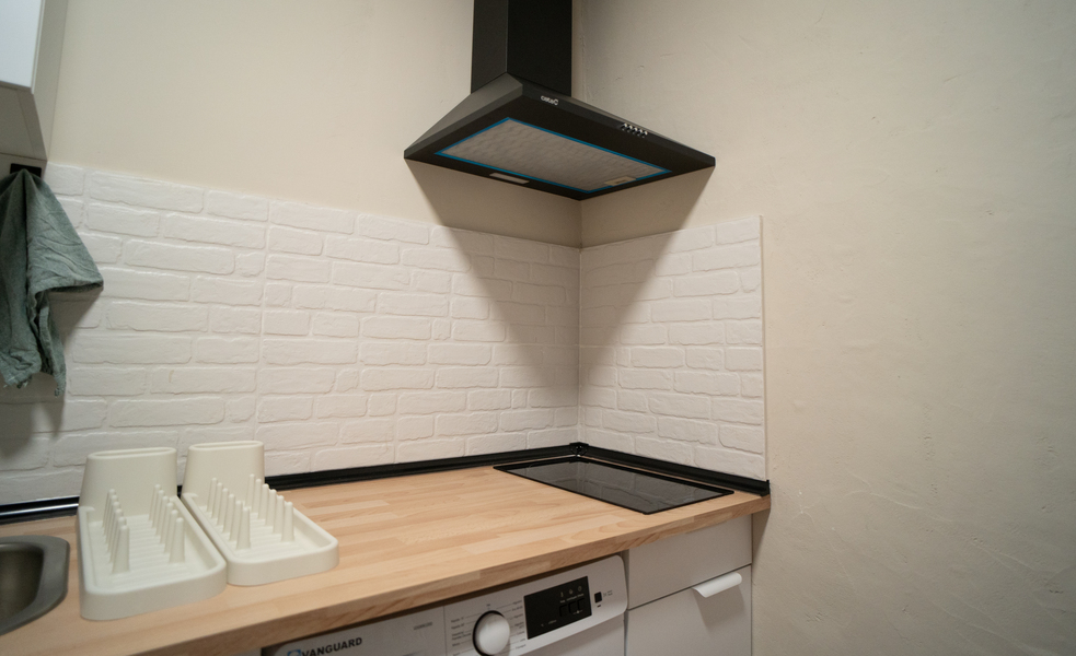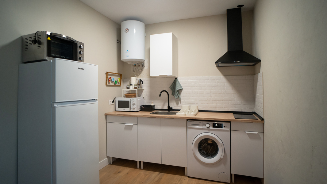 Cocina totalmente equipada con frigorífico con congelador, placa de inducción o vitrocerámica, microondas, fregadero, lavavajillas, cafetera, menaje completo (platos, vasos, cubiertos, sartenes, ollas) y utensilios básicos de cocina (abrelatas, espátula, cucharón, cuchillo de cocina, etc.)