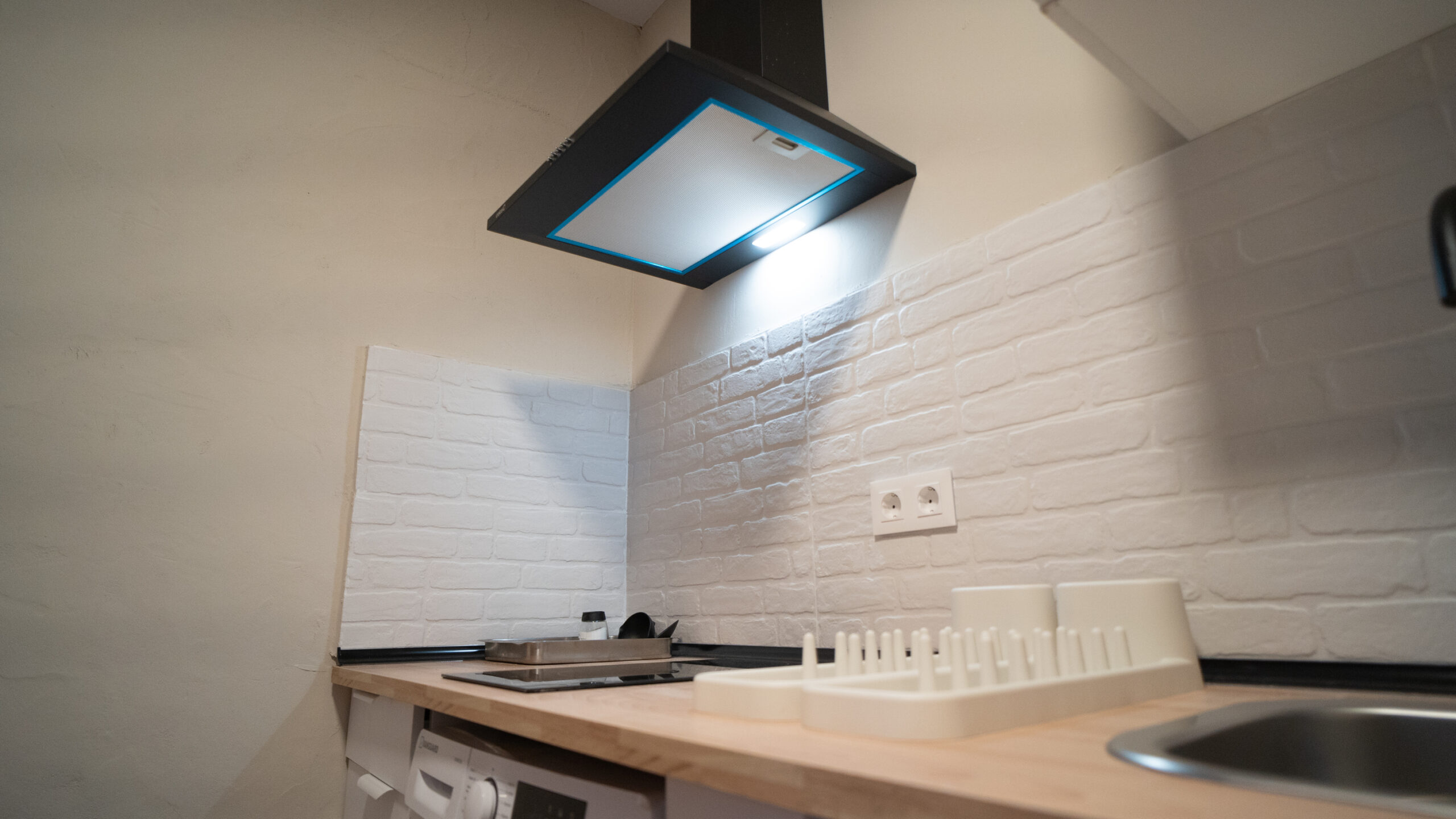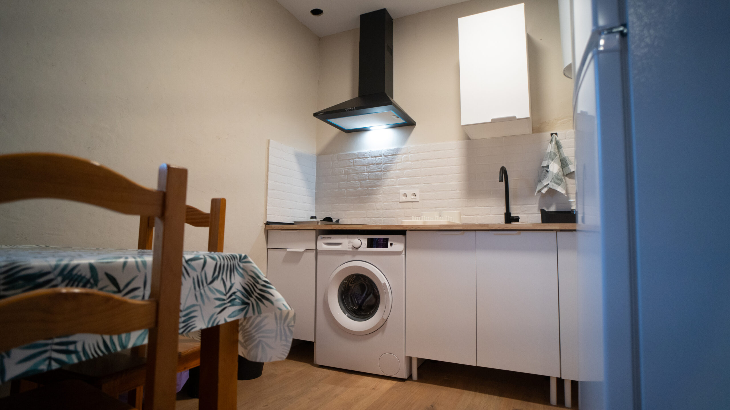 Cocina totalmente equipada con frigorífico con congelador, placa de inducción o vitrocerámica, microondas, fregadero, lavavajillas, cafetera, menaje completo (platos, vasos, cubiertos, sartenes, ollas) y utensilios básicos de cocina (abrelatas, espátula, cucharón, cuchillo de cocina, etc.)