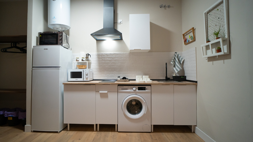• Cocina totalmente equipada con frigorífico con congelador, placa de inducción o vitrocerámica, microondas, fregadero, lavavajillas, cafetera, menaje completo (platos, vasos, cubiertos, sartenes, ollas) y utensilios básicos de cocina (abrelatas, espátula, cucharón, cuchillo de cocina, etc.)