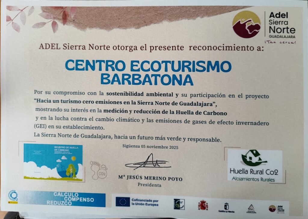 El día 5 de noviembre participamos en la jornada “La Sierra Norte de Guadalajara: hacia un turismo cero emisiones”, celebrada en Sigüenza, donde se reconoció nuestro esfuerzo —junto a otros establecimientos del territorio— en la medición, reducción y compensación de la Huella de Carbono, un paso esencial hacia un modelo de turismo más responsable y sostenible.